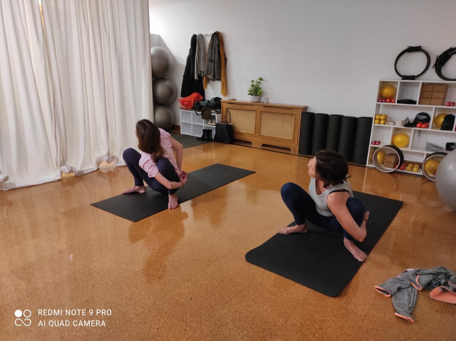 Empezamos con lo que llamamos la «toma de consciencia» para situarnos en el aquí y el ahora. Continuamos con posturas suaves en la esterilla para entrar en calor y movilizar el cuerpo lentamente.